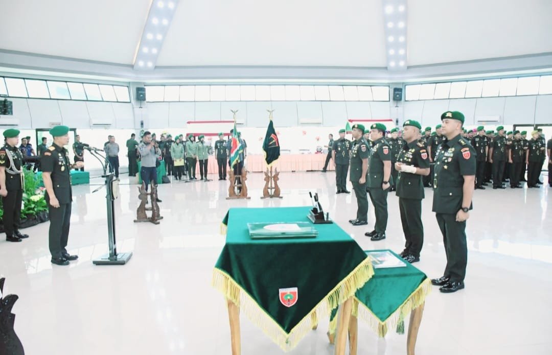 Pangdam XIV/Hasanuddin Mayjen TNI Dr. Totok Imam Santoso, SIP, S.Sos, M.Tr.(Han) memimpin upacara Serah Terima Jabatan (Sertijab) pejabat Kodam XIV/Hasanuddin, bertempat di Balai Pertemuan Hasanuddin (BPH) Makodam, Kota Makassar, Rabu (03/05/2023).