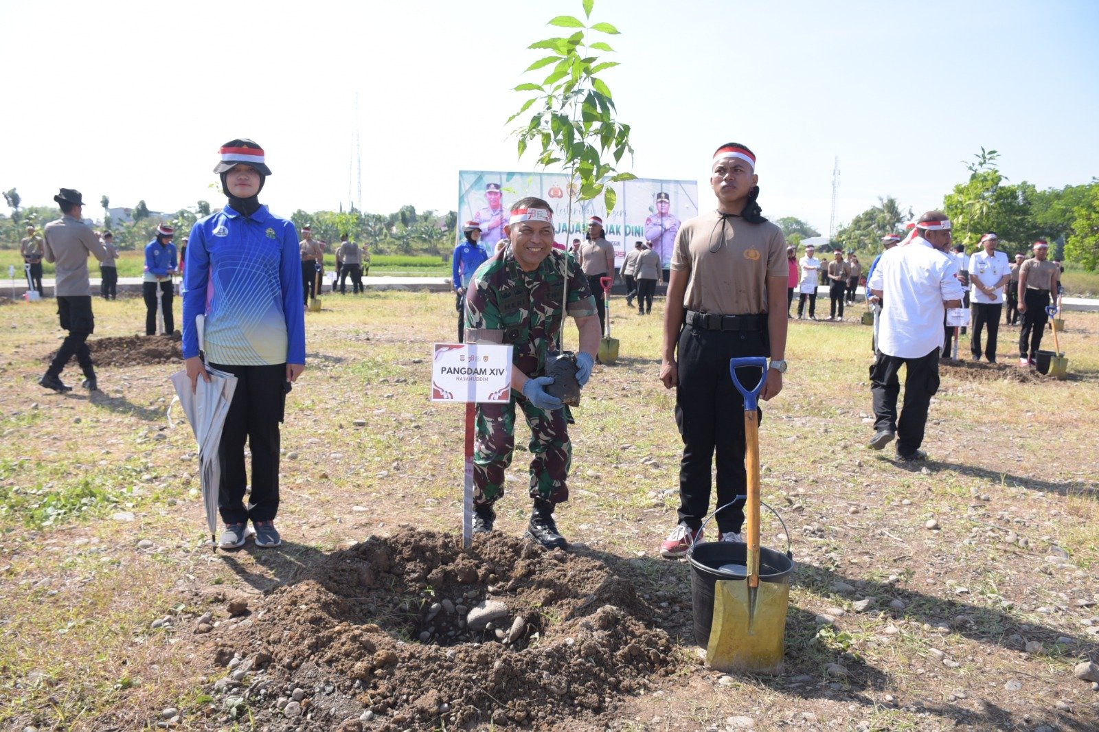 Kapoksahli Pangdam XIV/Hasanuddin Brigjen TNI Heri Sutrisma, SH, MA mewakili Pangdam, menghadiri penanaman pohon secara serentak dan Hybrid, berlokasi di Paccerakkang, Kota Makassar, Rabu (23/08/2023).