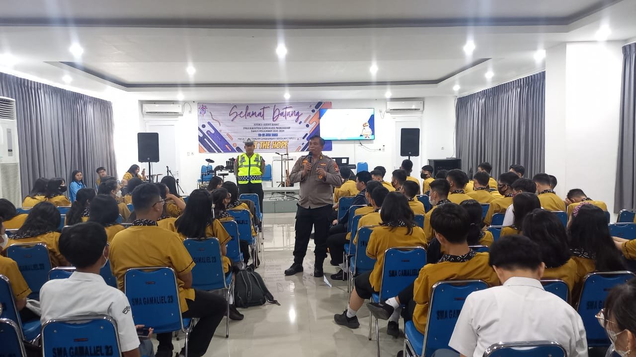 Tanamkan Disiplin Lalu Lintas, Satlantas Polres Pelabuhan Makassar yang dipimpin Kabag SDM AKP Samuel sambangi SMA Kristen Gamaliel dalam rangka memberikan imbauan keselamatan di jalan raya.