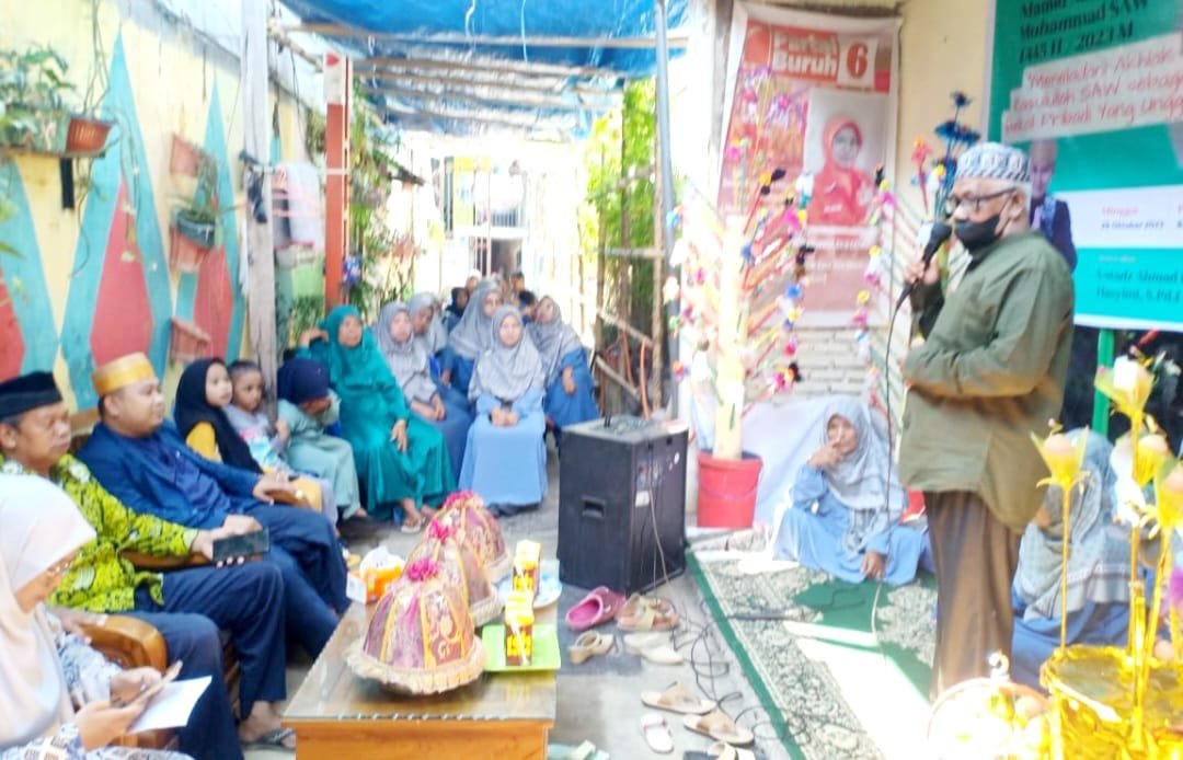 Anggota Calon Legislatif (Caleg) DPRD Kota Makassar Dapil V Mamarita dari Partai Buruh Nurunnisa Aulia Kadir hadiri acara peringatan Maulid Nabi Besar Muhammad SAW 1445 Hijriah, bertempat di kediaman Ketua Kerukunan Keluarga Toddopulia Bersatu Jalan Daeng Ngeppe, Kelurahan Jongaya, Kecamatan Tamalate, Kota Makassar, Minggu (29/10/2023).