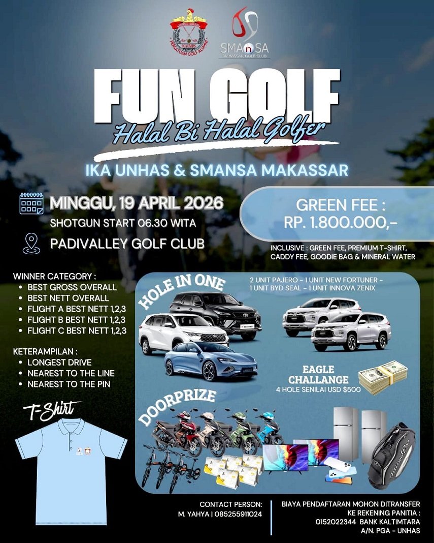 Dua komunitas besar, Persatuan Golf Alumni (PGA) Universitas Hasanuddin (Unhas) dan Ikatan Alumni (IKA) SMA Negeri 1 (SMANSA) Makassar Golf, bersiap menggelar perhelatan olahraga istimewa. Mengusung tajuk "Fun Golf Halal Bi Halal Golfer IKA Unhas & SMANSA", turnamen ini dijadwalkan menghentak lapangan Padivalley Golf Club, Kabupaten Gowa, pada Minggu, 19 April 2026 mendatang.