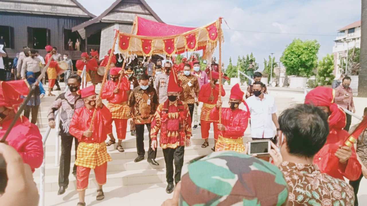 Personel Polres Gowa melakukan kegiatan pengamanan kedatangan Menteri Pendayagunaan Aparatur Negara dan Reformasi Birokrasi (PAN-RB) Tjahjo Kumolo di Istana Balla Lompoa Kecamatan Somba Opu, Kabupaten Gowa, Rabu (14/10/2020).