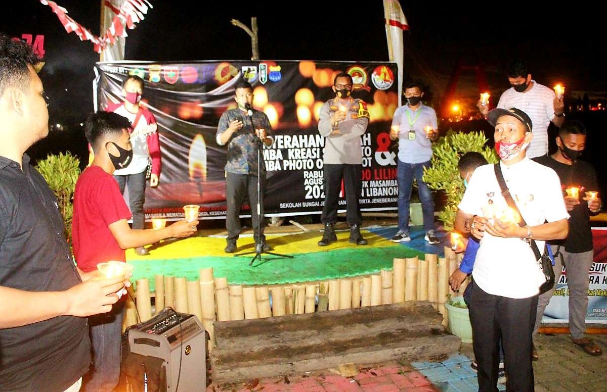 Pasca pemberian hadiah kepada pemenang Lomba Kreasi Foto dan Foto On The Spot, Kapolres Gowa AKBP Boy FS Samola bersama KNPI Kabupaten Gowa, Kepala Desa, mahasiswa dan para pemenang lomba melepas sebanyak 1.000 lilin dan obor di Bantaran Sungai Jeneberang, Sungguminasa, Kabupaten Gowa, Rabu (12/08/2020) malam.