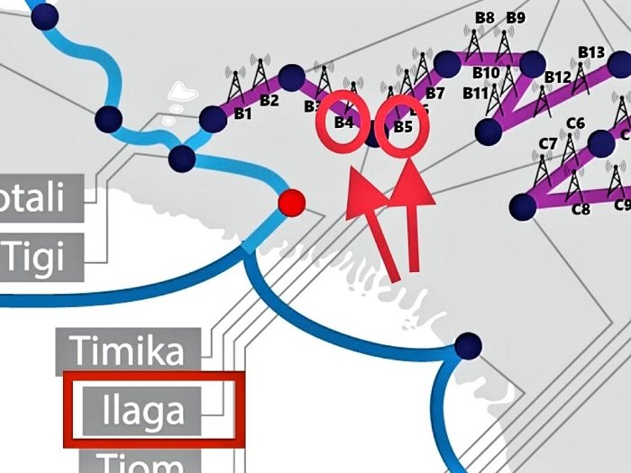 Dua tower BTS milik Telkom yang dibakar yaitu BTS 4 yang terletak di perbukitan Pingeli di Distrik Omukia dan BTS 5 yang terletak di wilayah muara yang terletak di Distrik Mabuggi, Kabupaten Puncak.