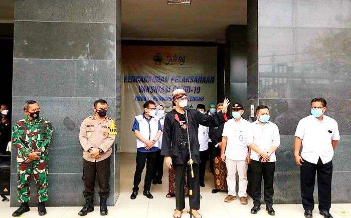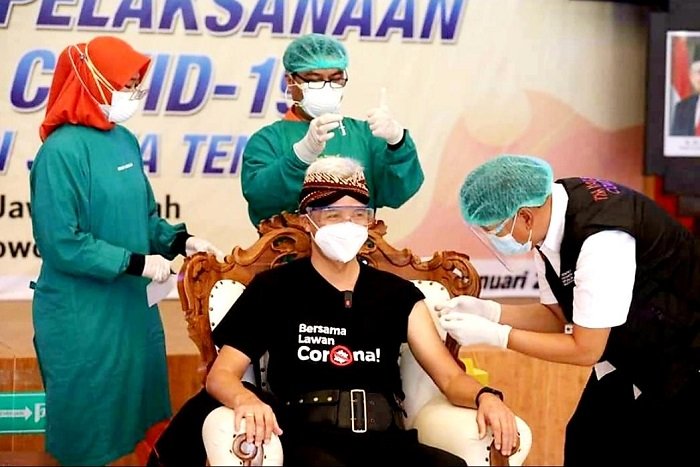 Gubernur Jawa Tengah, Ganjar Pranowo menjadi orang pertama di Jateng yang mendapatkan suntikan vaksin Covid-19. Mengajak Wakil Gubernur, Kapolda, Pangdam, Kajati, Wakil Ketua DPRD, Ketua Organisasi Profesi Dokter dan Perawat, Ketua MUI, Kemenag dan lainnya, Ganjar melakukan vaksinasi di RSUD Tugurejo Semarang, Kamis (14/01/2021).
