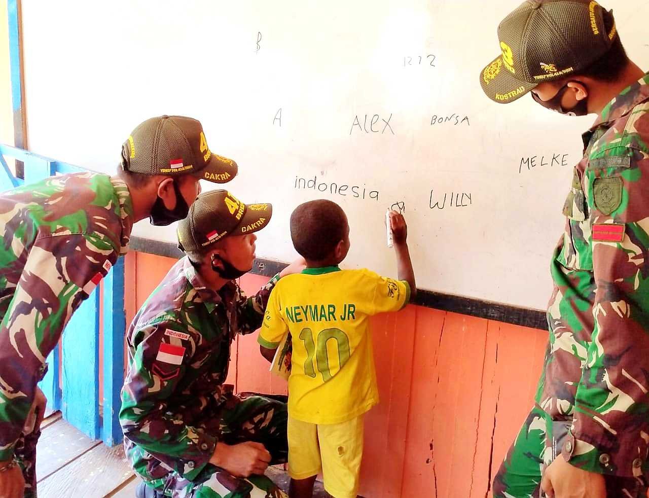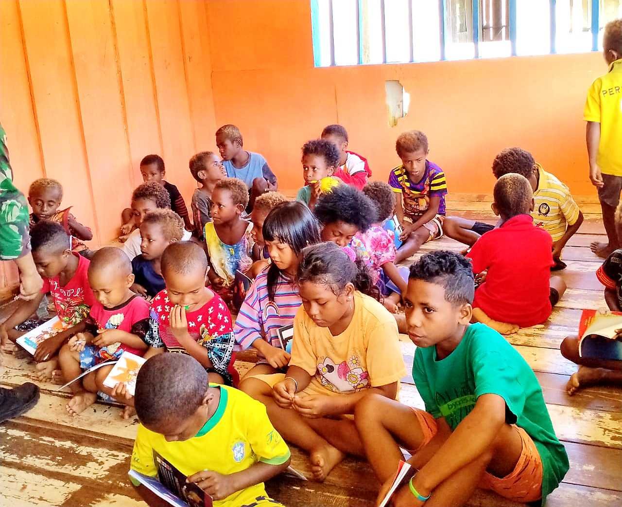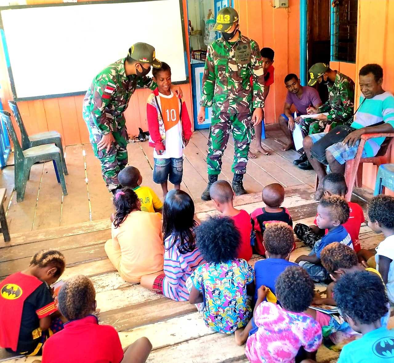 Bertempat di kediaman Kepala Kampung Skofro, Distrik Arso Timur, Kabupaten Keerom, Heri Kroom, Satgas Pamtas RI-PNG Yonif Mekanis Raider (MR) 413 Kostrad Pos Skofro Lama menggelar kelompok belajar usia dini dalam upaya mencerdaskan anak Papua di Perbatasan RI-PNG.