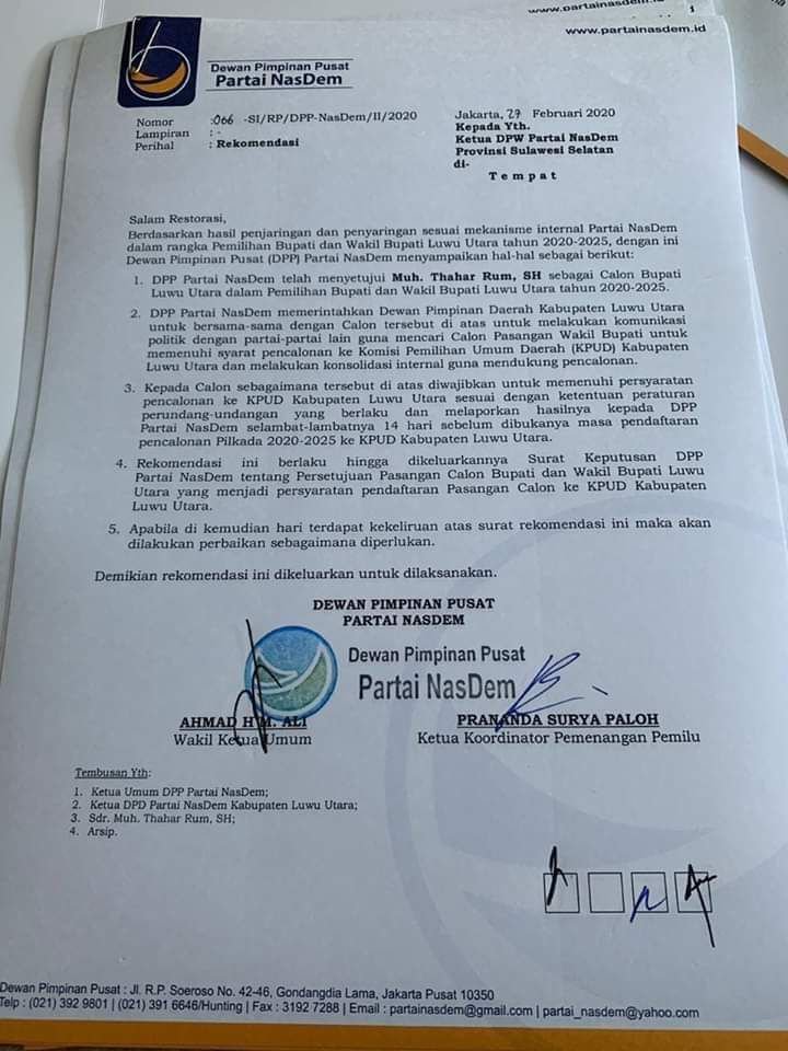 Surat Rekomendasi dari Partai NasDem Pusat dengan nomor 066-SI/RP/DPP-NasDem/II/2020 dan ditandatangani DPP Partai NasDem, Wakil Ketua Umum Ahmad HM Ali, Ketua Koordinator Pemenangan Pemilu, Prananda Surya Paloh. (yustus)