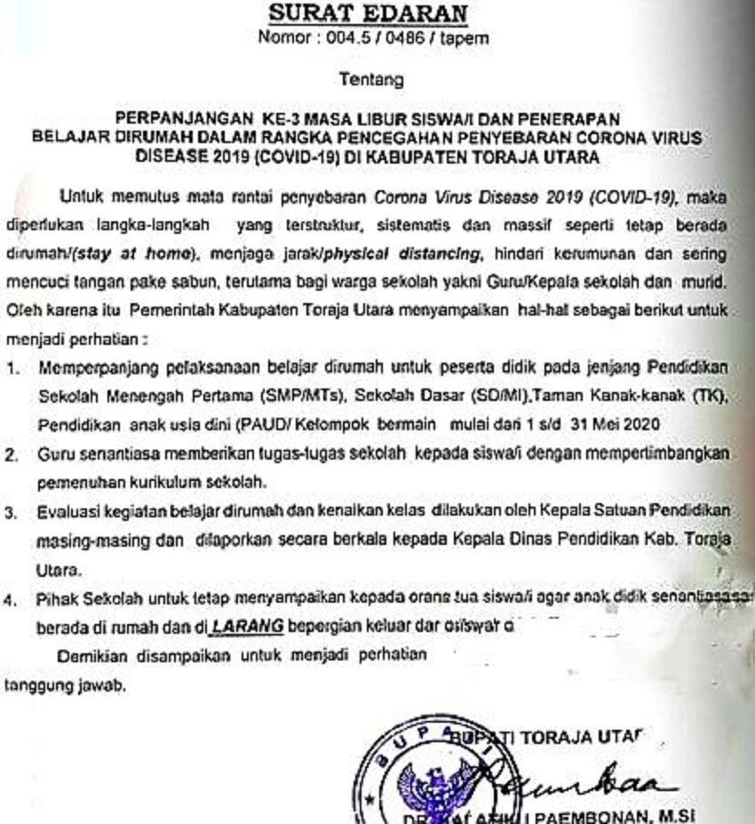 Bupati Kalatiku Paembonan kembali memperpanjang masa belajar bagi siswa-siswi di rumah dengan mengeluarkan Surat Edaran untuk jenjang SMP, PAUD/TK, dan MTs se-Kabupaten Toraja Utara, dan perpanjangan ini merupakan yang ketiga kalinya dikeluarkan pemerintah daerah.