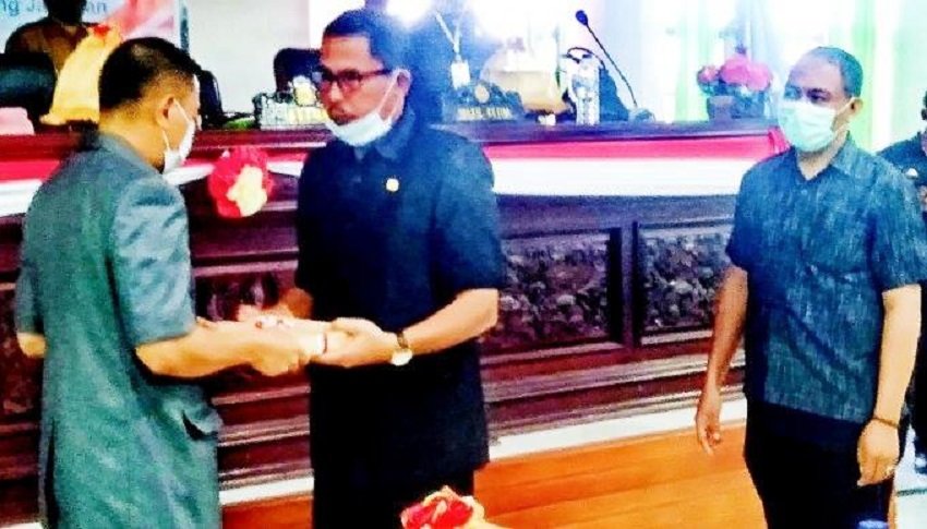 Bupati Kepulauan Selayar, H. Muh. Basli Ali menyerahkan naskah Ranperda tentang Laporan Pertanggung Jawaban (LPJ) pelaksanaan APBD Tahun Anggaran 2019, dalam rapat paripurna yang berlangsung di ruang sidang utama gedung DPRD Kepulauan Selayar, Jalan Jend. A. Yani, Kelurahan Benteng, Kamis (11/06/2020).