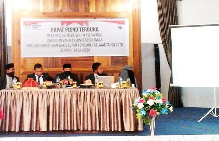 Rapat pleno terbuka rekapitulasi hasil verifikasi faktual (verfak) dukungan bakal pasangan calon (bapaslon) perseorangan, dalam pemilihan Bupati dan Wakil Bupati Kabupaten Kepulauan Selayar tahun 2020, dihelat secara resmi oleh jajaran Komisi Pemilihan Umum (KPU) Kabupaten Kepulauan Selayar, Senin (20/07/2020) di gedung PKK, Jln. Muh. Krg Bonto, Kota Benteng.