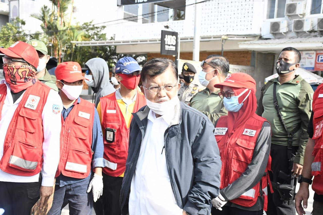 Jusuf Kalla juga meninjau posko tanggap darurat bencana PMI serta pengungsi, khususnya anak-anak.