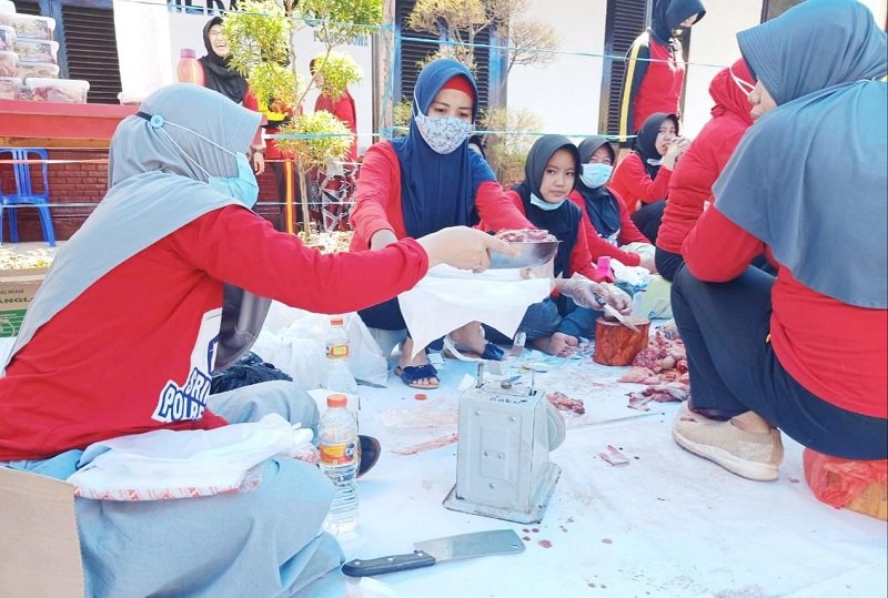 Selain itu tampak personel Polwan dan ASN Polres Gowa turut bekerjasama bahu-membahu memotong kemudian menimbang serta memasukkan daging kedalam suatu wadah lalu diserahkan kepada warga yang telah memiliki kupon.