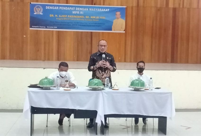 Kembali, Anggota MPR RI Dr. H. Ajiep Padindang, SE, MM, melakukan Dengar Pendapat dengan Masyarakat (DPM) di Kabupaten Soppeng dengan mengusung tema “Sistem Ketatanegaraan Berdasarkan UUD NRI Tahun 1945 Serta Pelaksanaannya.” Dengar Pendapat ini bekerja sama dengan Pendamping PKH Kabupaten Soppeng, dilaksanakan di Gedung Pertemuan Masyarakat Kabupaten Soppeng, (06/11/2020). Peserta DPM berasal dari kalangan Pekerja Sosial dan Tokoh Masyarakat Kabupaten Soppeng sebanyak 150 orang. Turut hadir, Koordinator Pendamping PKH Kabupaten Soppeng, Supriadi, SE.