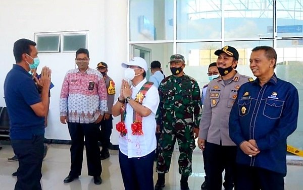 Sekda Kepulauan Selayar, Dr. Ir. H. Marjani Sultan, M.Si bersama anggota Forum Komunikasi Pimpinan Daerah, didampingi beberapa pejabat Tingkat Asisten, beberapa Kepala OPD menyambut kedatangan Anggota Komisi VI, DPR RI dari Fraksi NasDem, Muhammad Rapsel Ali, di Bandar Udara (Bandara) H. Aroeppala Padang, Kepulauan Selayar, Kamis (12/11/2020).
