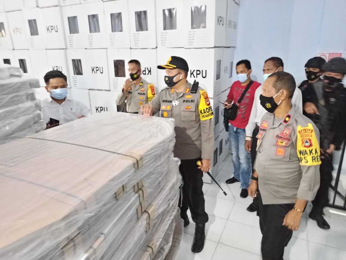 Kapolres Luwu Utara, AKBP Irwan Sunuddin didampingi Wakapolres Kompol H. Amir Majid, Selasa (17/11/2020), turun langsung mengecek Objek vital logistik pemilu di gudang logistik KPU Lutra, Sulawesi Selatan di jalan Trans Sulawesi, Kelurahan Baliase, Kecamatan Masamba.