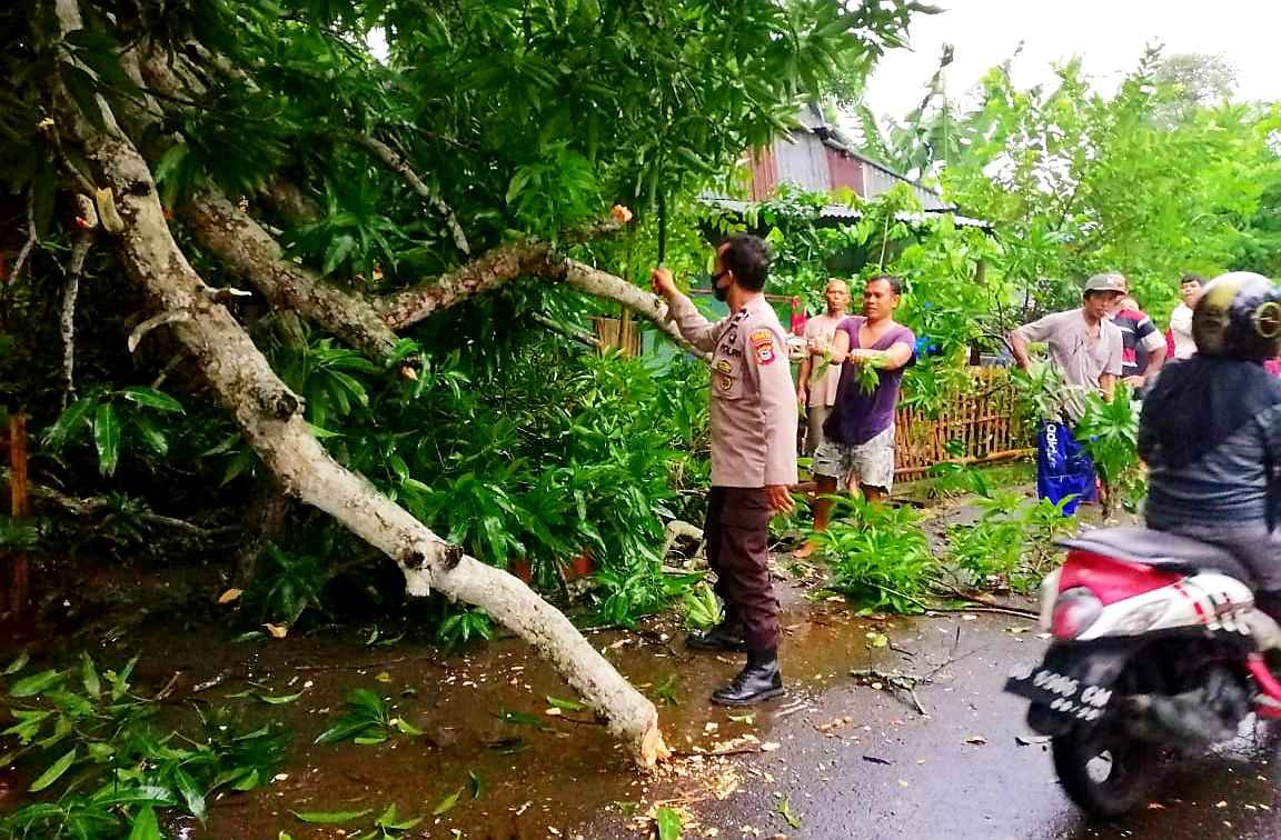 Kepala SPK Polsek Mappakasunggu Polres Takalar Aiptu Abd Malik Sila bersama anggotanya dan warga membersihkan pohon mangga yang tumbang di jalan poros Kecamatan Sanrobone, Kabupaten Takalar yang roboh akibat terpaan angin saat hujan.
