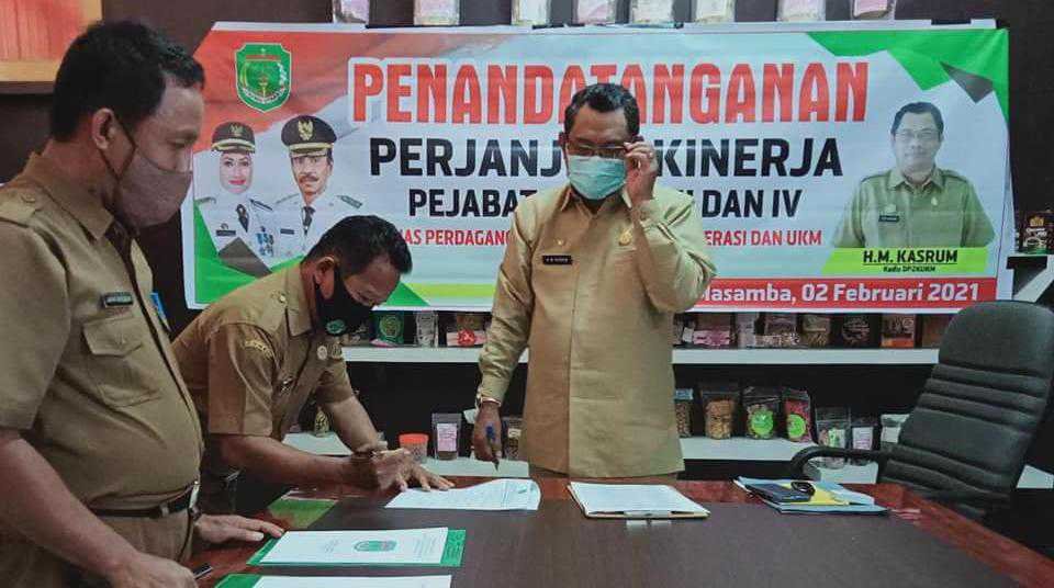 Seluruh pejabat administrator dan pengawas lingkup Dinas Perdagangan Perindustrian Koperasi dan Usaha Kecil Menengah (P2KUKM) Kabupaten Luwu Utara (Lutra), Sulawesi Selatan, menandatangani pakta integritas dan perjanjian kinerja, di Aula Kantor Gabungan Dinas Pemkab Lutra, Selasa (2/2/2021).