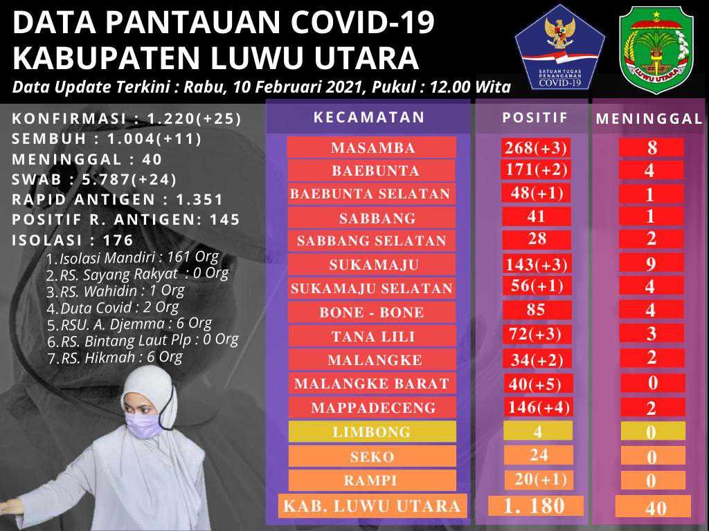 Angka kasus terkonfirmasi positif Covid-19 di Kabupaten Luwu Utara (Lutra), Sulawesi Selatan, hari ini Rabu (10/2/2021), terus mengalami peningkatan.