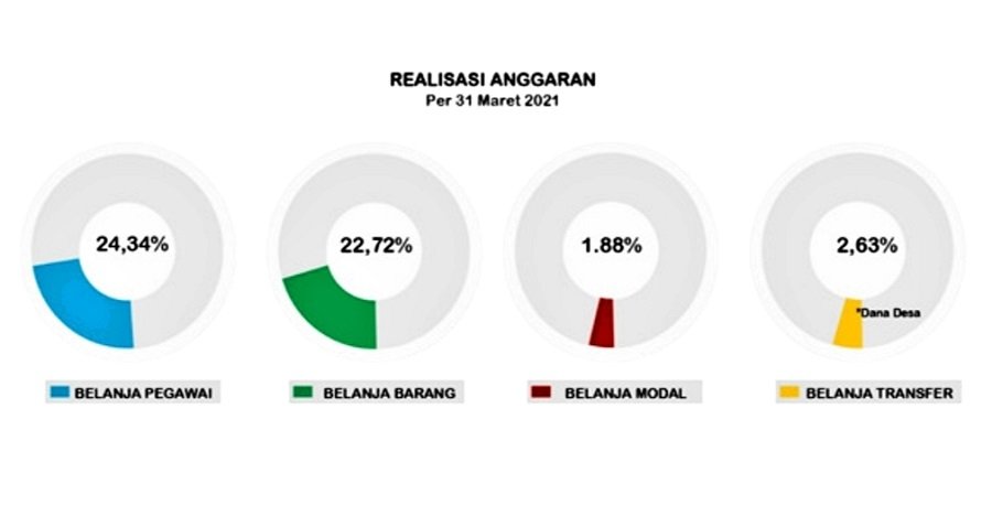 Sedangkan realisasi dari dana Transfer ke Daerah dan Dana Desa (TKDD) baru mencapai Rp 13,14 miliar atau 4,25% dari total pagu Rp 307,19 miliar. Berdasarkan komponen belanjanya, penyerapan anggaran terdiri dari belanja pegawai sebesar Rp 24,90 miliar atau 24.34% disusul belanja barang sebesar Rp 9,33 miliar atau 22,72%, dan belanja modal sebesar Rp 891 juta atau 1,88%, serta Dana Desa sebesar Rp 13,14 miliar atau sebesar 18%.