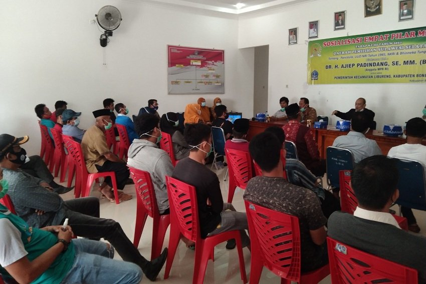 Sosialisasi Empat Pilar MPR RI tentang Pancasila, UUD NRI Tahun 1945, NKRI, dan Bhinneka Tunggal Ika, terus dilaksanakan Anggota MPR RI, Dr. H. Ajiep Padindang, SE, MM. Kali ini, sosialisasi diberikan kepada Aparat Pemerintah Kecamatan, Aparat Desa, dan tokoh masyarakat, Kecamatan Libureng, Kabupaten Bone, beberapa waktu lalu.