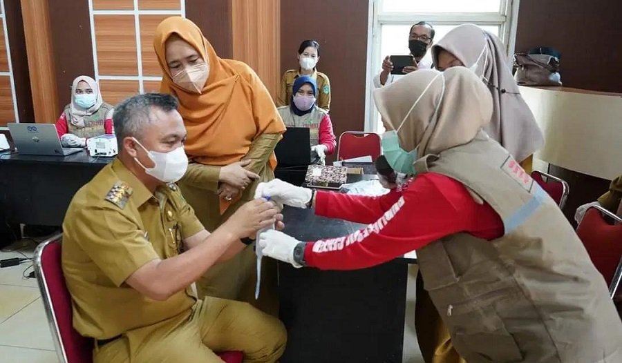 Tes GeNose diawali Bupati Luwu Timur Drs.H. Budiman Hakim, M.Pd kemudian Sekda H Bahri Suli, lalu para Kepala OPD dan seluruh ASN lingkup Sekretariat Daerah.