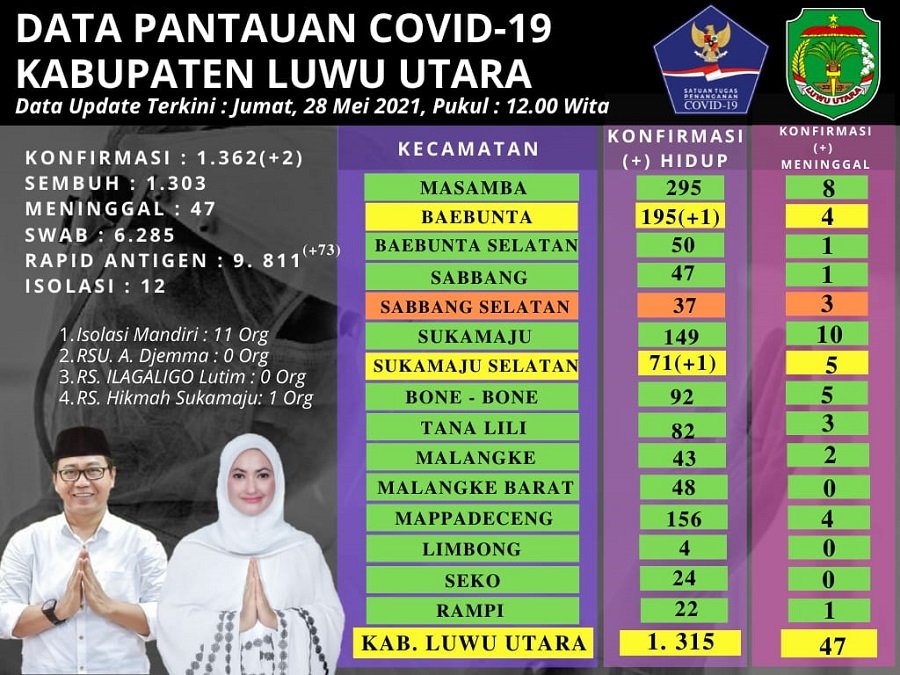 "Total sampai hari ini telah 1.362 orang warga Bumi Lamaranginang terinfeksi covid-19. Terjadi penambahan 12 orang warga Lutra positif terinfeksi covid-19,” kata Juru Bicara Satgas Covid-19, I Komang Krisna, SKM, M.Kes, Jumat 28 Mei 2021.