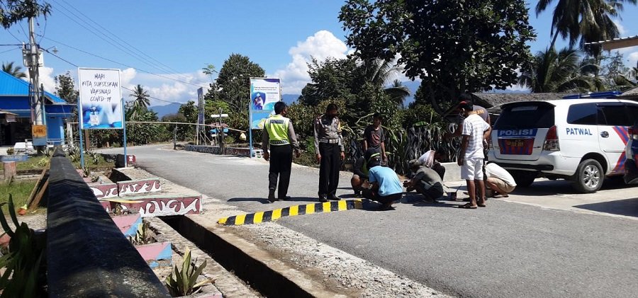 Anggota Satlantas Polres Kabupaten Luwu Utara melakukan gotong-royong dengan melakukan pengecatan marka jalan untuk membuat kampung atau desa percontohan tertib lalu lintas, di Desa Batu Alang Kecamatan Sabbang Selatan, Kamis 17 Juni 2021.
