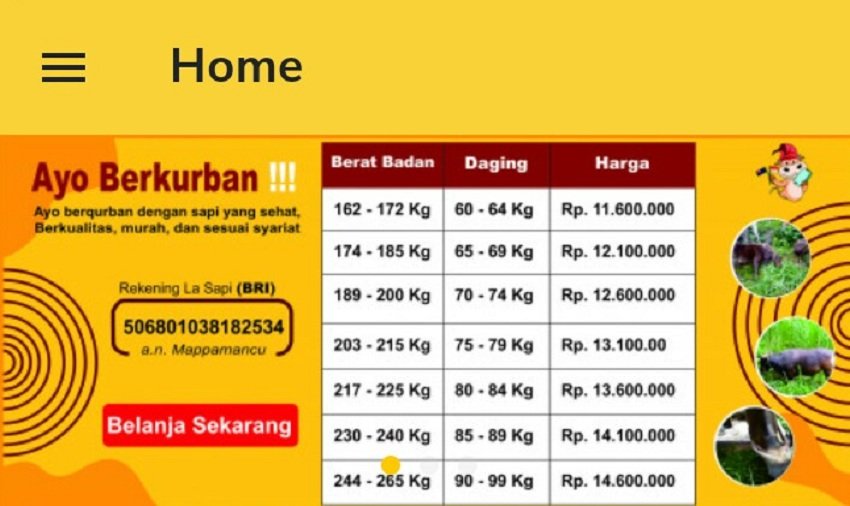 Menjelang hari raya kurban, aplikasi LA SAPI menawarkan penjualan secara online dengan pengantaran khusus ke tujuan di Kota Makassar secara gratis.