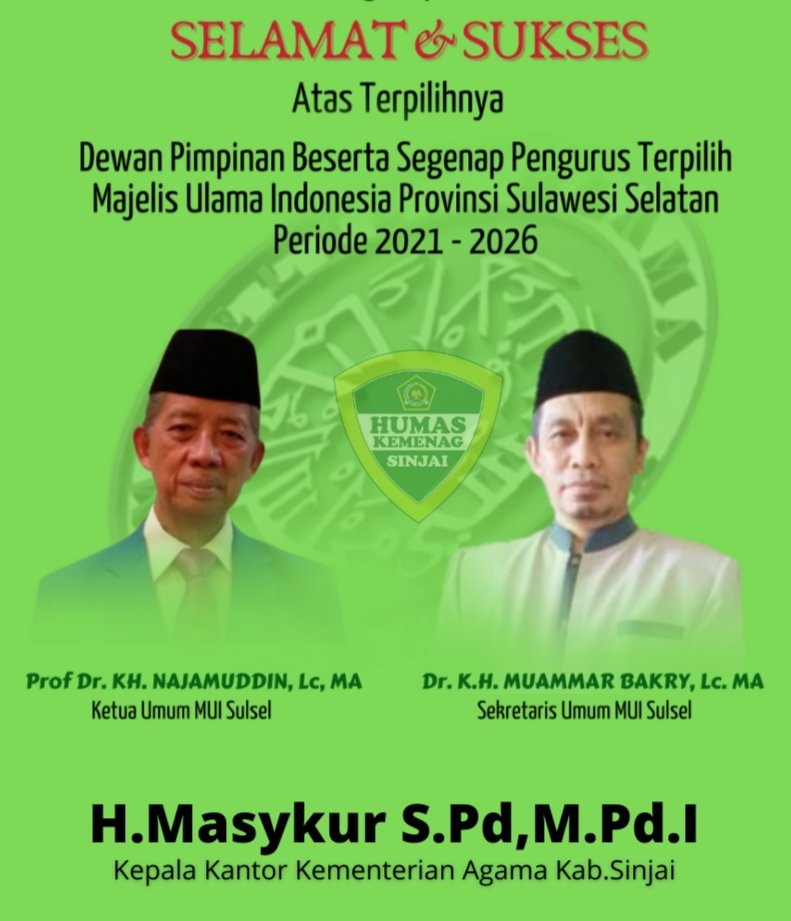 Sementara Itu Kepala Kantor Kementerian Agama Kabupaten Sinjai H. Masykur menyampaikan ucapan selamat dan suskes atas terpilihnya Prof Dr KH. Najmuddin, Lc, MA sebagai nahkoda baru MUI Provinsi Sulawesi Selatan dan Sekretaris Umum MUI Sulsel KH. Muammar Bakry, Lc, MA periode 2021-2026.