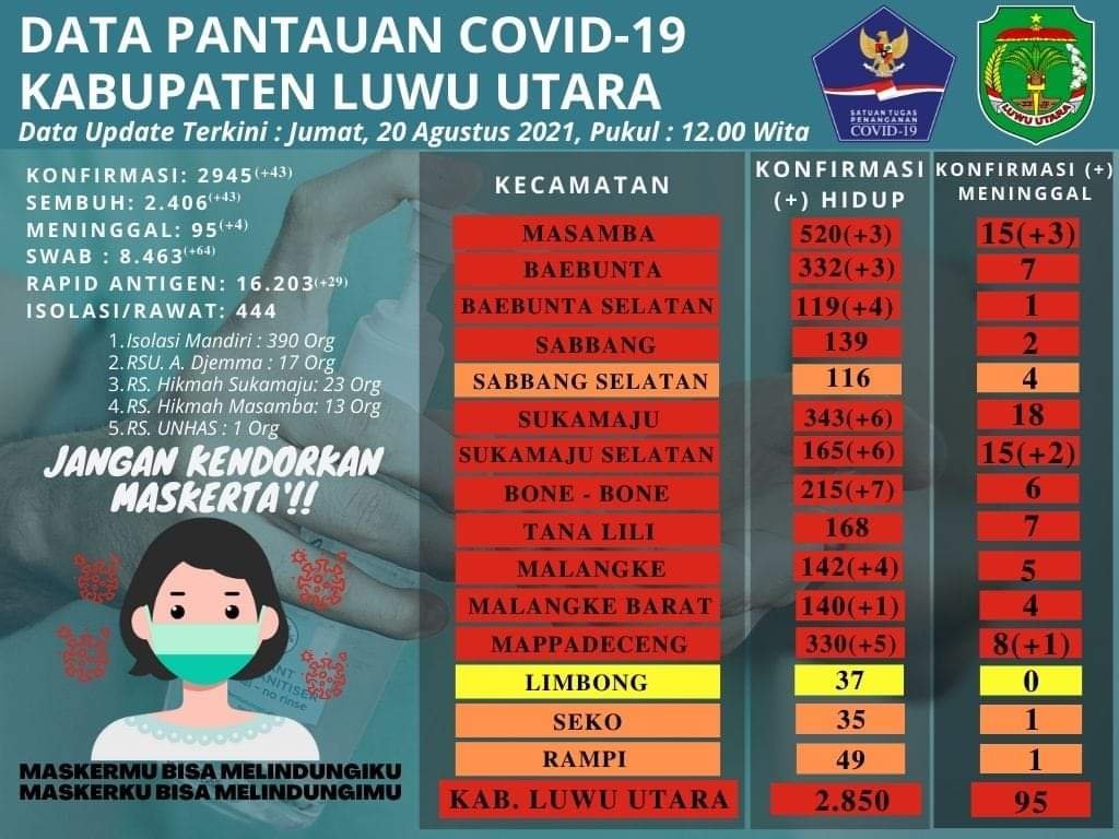 "Hal tersebut disampaikan Komang Krisna Juri Bicara (Jubir) Covid-19 Lutra pada media ini via whatsapp bahwa, data pantauan covid-19 di Kabupaten yang berjuluk Bumi Lamaranginang hingga Jumat (20/8) ada tambahan 43 kasus baru yang terinfeksi corona. Sehingga total menjadi 2945 kasus positif Corona dan konfirmasi hidup berjumlah 2850 orang," sebutnya.