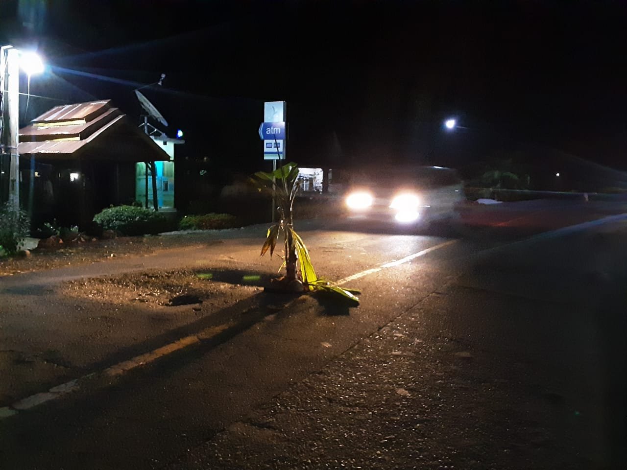 Menurut Rustam, sebelum ada pohon pisang itu pun dirinya sudah menaruh ban bekas dan kerucut agar pengendara mengetahui ada lubang, dan malam ini para pemuda Tarue ngecor lubang tersebut dan dikasih tanda kayu dengan dibungkus baliho, agar pengendara motor bisa melihatnya," terang Ketua BPD Buangin.