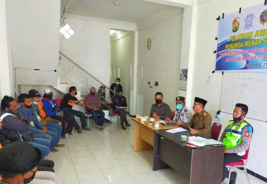 Kepala Badan Pendapatan Daerah (Bapenda) Toraja Utara Alexander Tiku dalam pelatihan Jukir di kantor Mekar Sejahtera sebagai Narasumber dengan materi peraturan perundang-undangan dalam sistem pengelolaan perparkiran yang propesional dalam meningkatkan Pendapatan Asli Daerah ( PAD ) Toraja Utara, Senin 27/09/2021.