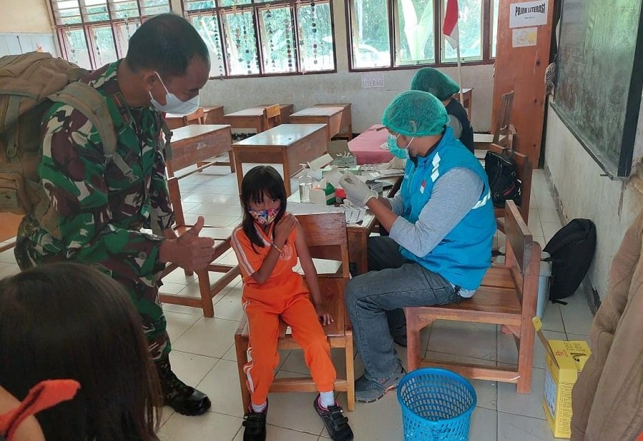 Pelaksanaan imunisasi (vaksinasi) bagi bagi pelajar untuk usia 6-11 tahun terus dimonitor oleh Danramil 1414-01/Makale Tana Toraja (Tator) bersama anggota.