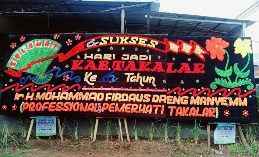 Tidak hanya sebaran baliho yang dipasang di beberapa titik strategis di Takalar, namun juga menghadirkan karangan bunga raksasa menghiasi halaman kantor DPRD Takalar. Tampak terpajang bertuliskan sukses hari jadi Takalar ke-62 tahun, Ir. H. Mohammad Firdaus Daeng Manye, MM tokoh profesional dan pemerhati Takalar.