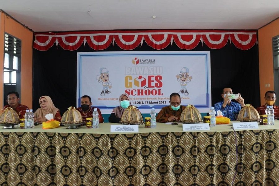 Badan Pengawas Pemilu (Bawaslu) Kabupaten Bone menggelar kegiatan Goes to School di SMAN 1 Watampone, Kamis (17/3/2022). Peserta Goes to School ini diikuti sebanyak 45 orang utusan dari siswa kelas 2 dan 3 SMAN 1 Watampone, SMAN 3 Watampone, SMAN 12 Watampone, MAN 2 Watampone dan MA Al Junaidiyah Biru Bone.