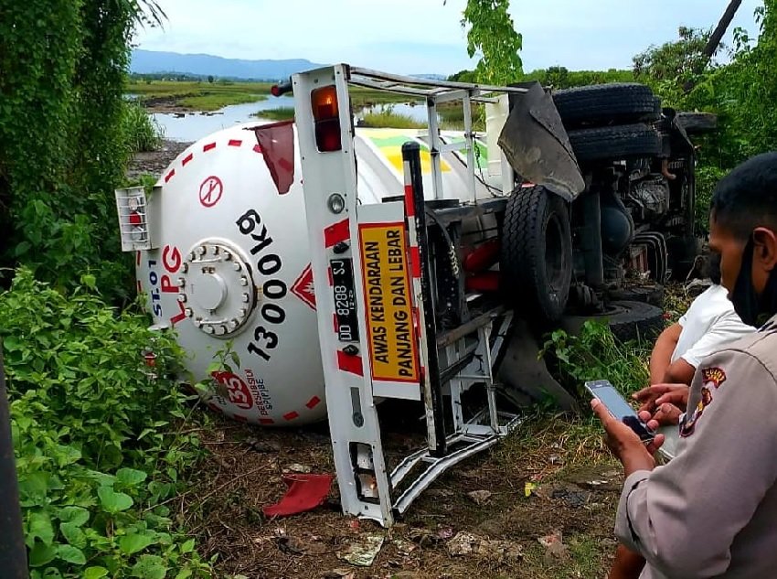 Kanit Binmas Polsek Marbo, Aiptu Syahrir menjelaskan kepada awak media ini, sepeda motor Yamaha Jupiter meluncur dari arah Jeneponto dan tiba-tiba datang mobil tangki bermuatan gas yang diduga menyerempet sepeda motor tersebut. Sopir kemudian banting setir ke kiri hingga akhirnya terbalik masuk ke empang.