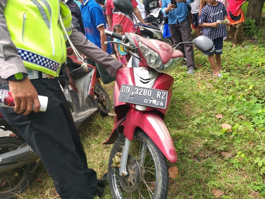 Akibat diserempet, sepeda motor yang dikendarai berboncengan pasangan suami isteri terjatuh di tengah jalan. Sang suami berinisial MD yang mengemudikan sepeda motor mengalami luka parah sehingga langsung dilarikan ke rumah sakit. Sementara isterinya Fatimah (55) pekerjaan IRT warga Kampung Bungun-bungun, Kelurahan Bulujaya, Kecamatan Bangkala Barat, Kabupaten Jeneponto meninggal dunia di TKP.