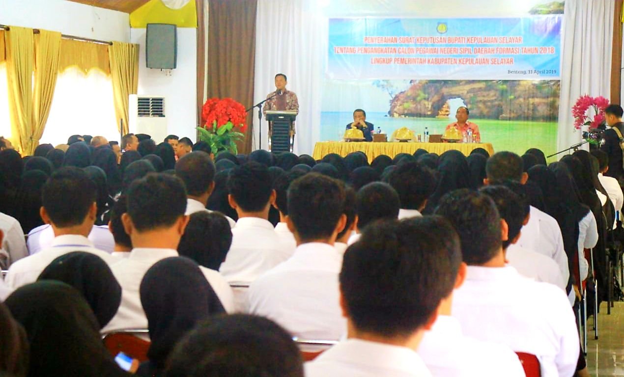 Sebanyak 241 orang Calon Pegawai Negeri Sipil Daerah (CPNSD) Kabupaten Kepulauan Selayar Formasi Tahun 2018, menerima SK CPNS, yang diserahkan secara simbolis oleh Bupati Kepulauan Selayar H. Muh. Basli Ali di Baruga Rumah Jabatan Bupati, Kamis (11/04/2019).