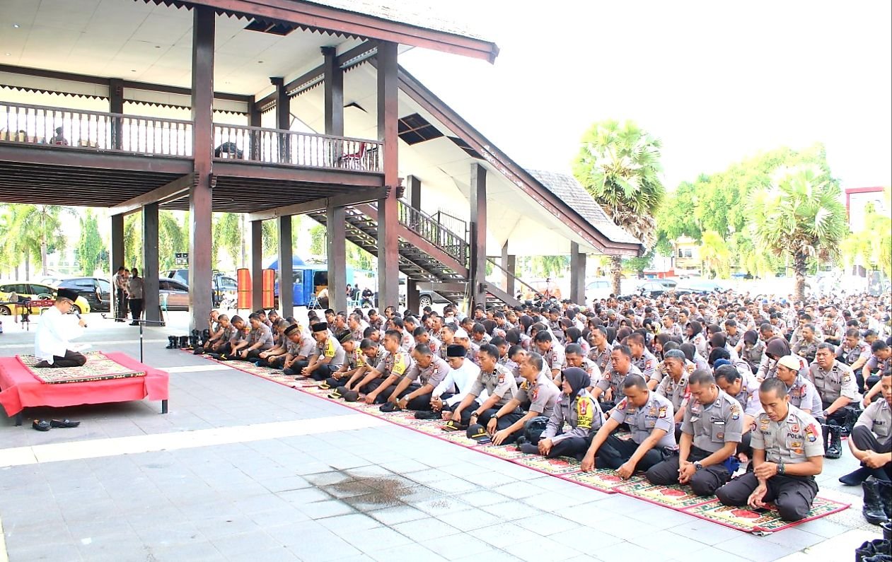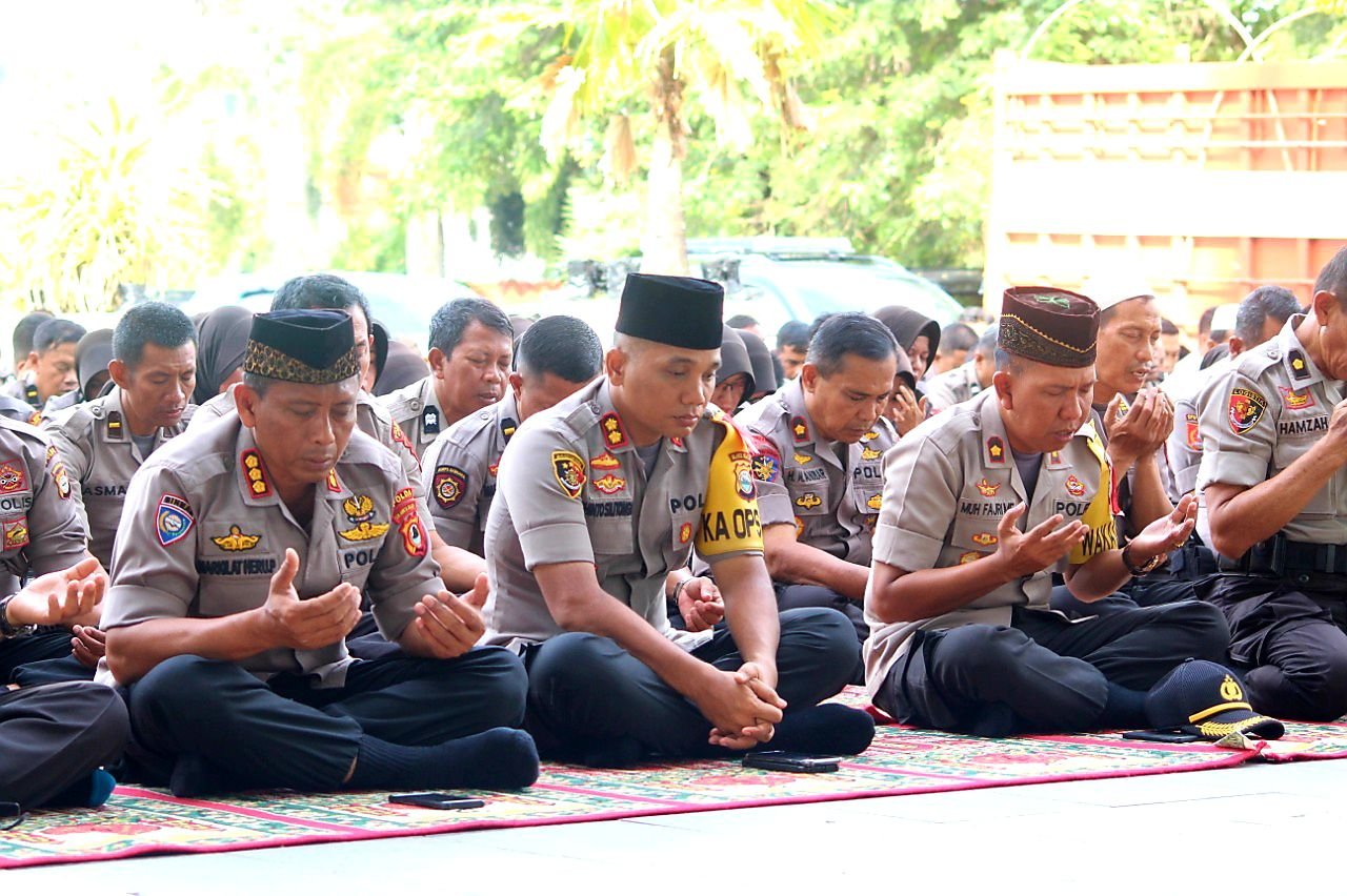 Tampak suasana begitu hikmat tatkala seluruh personil pun menundukkan kepala seraya mendengar lantunan doa yang diucapkan untuk mengantar para personil yang akan melaksanakan tugasnya mengamankan jalannya Pemilu 2019.