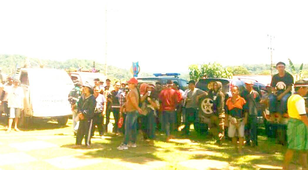 Warga Buakayu datang di kantor bupati dengan seragam menggunakan ikat kepala (beke') warna merah putih menandakan sebagai lambang cinta NKRI.