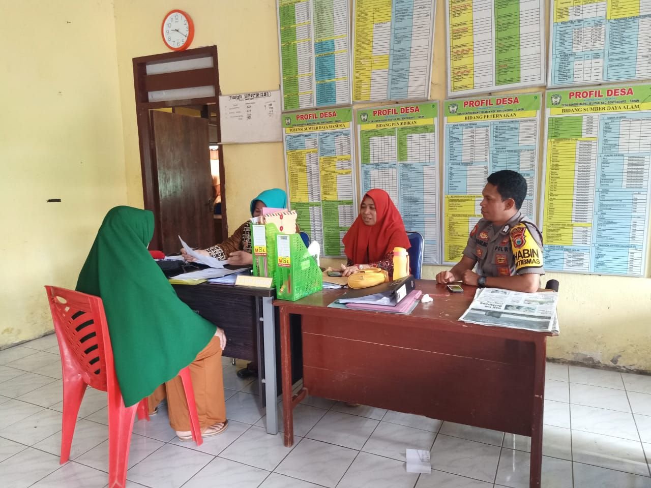 Bhabinkamtibmas Desa Bontobiraeng Selatan Polsek Bontonompo Gowa Bripka Maazdarling melakukan kunjungan rutin ke Kantor Desa Bontobiraeng Selatan, Kecamatan Bontonompo Kabupaten Gowa, Kamis (20/2/2020).