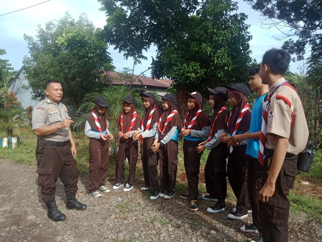 Pada Kesempatan ini Bhabinkamtibmas mengajak dan memberikan pesan Kamtibmas kepada pelajar khususnya pramuka untuk berperan aktif menjaga almamaternya.