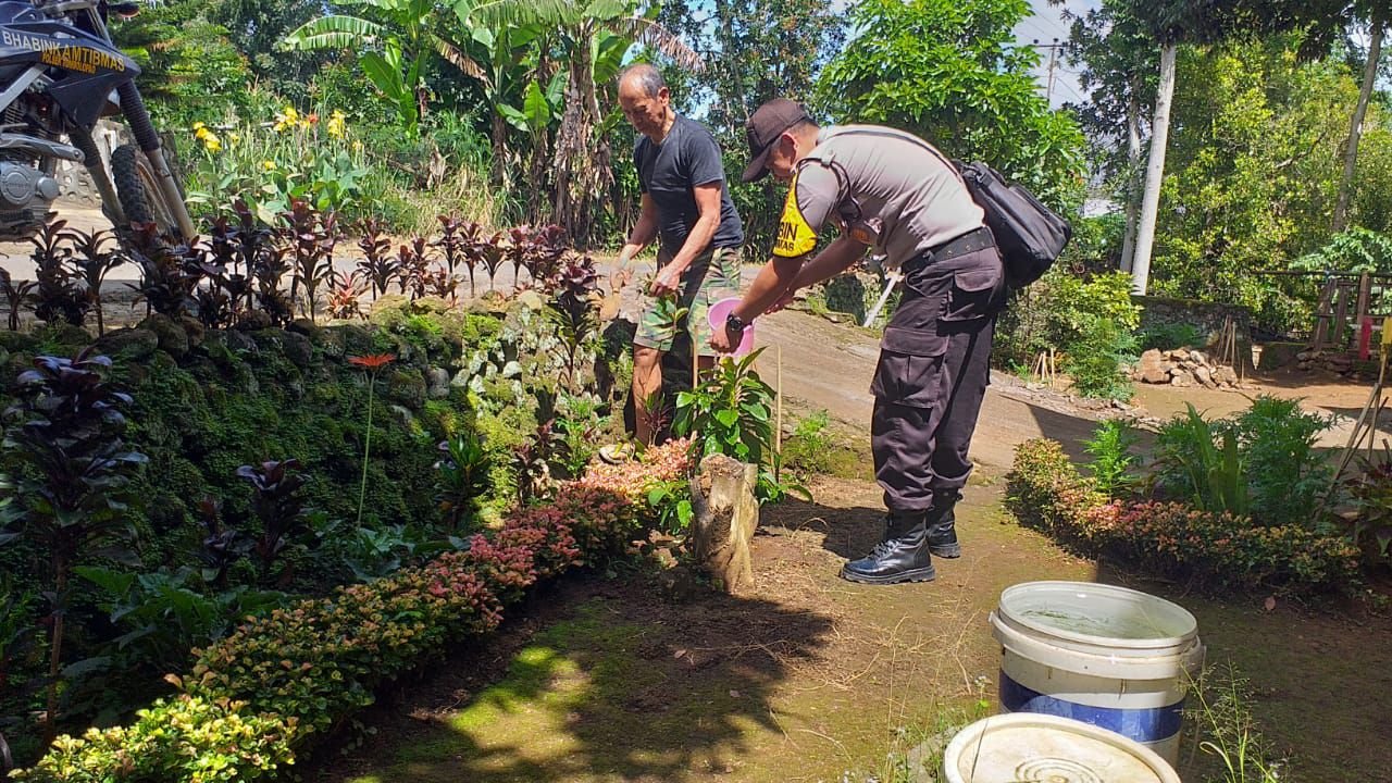 Bhabinkamtibmas Kelurahan Tamaona Polsek Tombolo Pao, Bripka Suherman melaksanakan perawatan tanaman untuk penghijauan yang berlokasi di sekitar taman depan rumah Syafruddin Puang Nassa di lingkungan Bonto Pannu, Senin (20/1/2020) sekitar pukul 10.00 Wita.