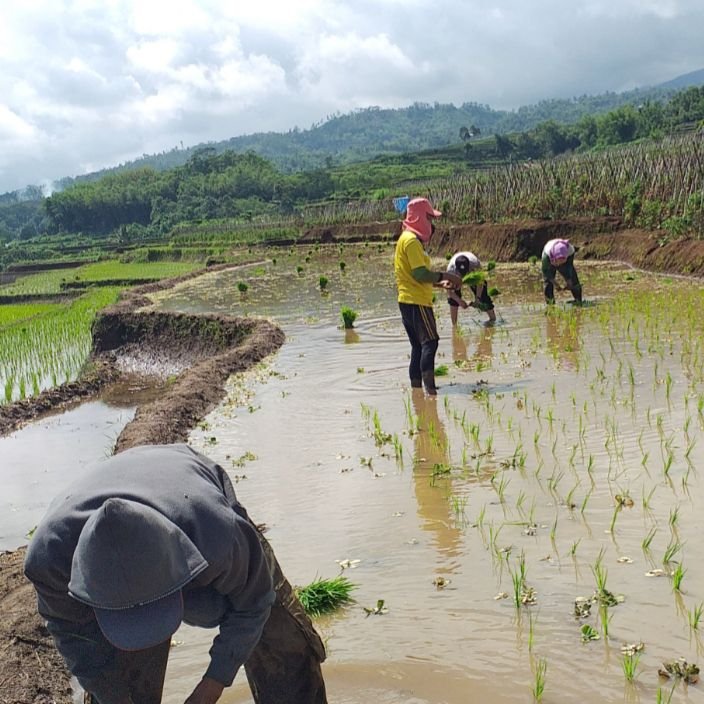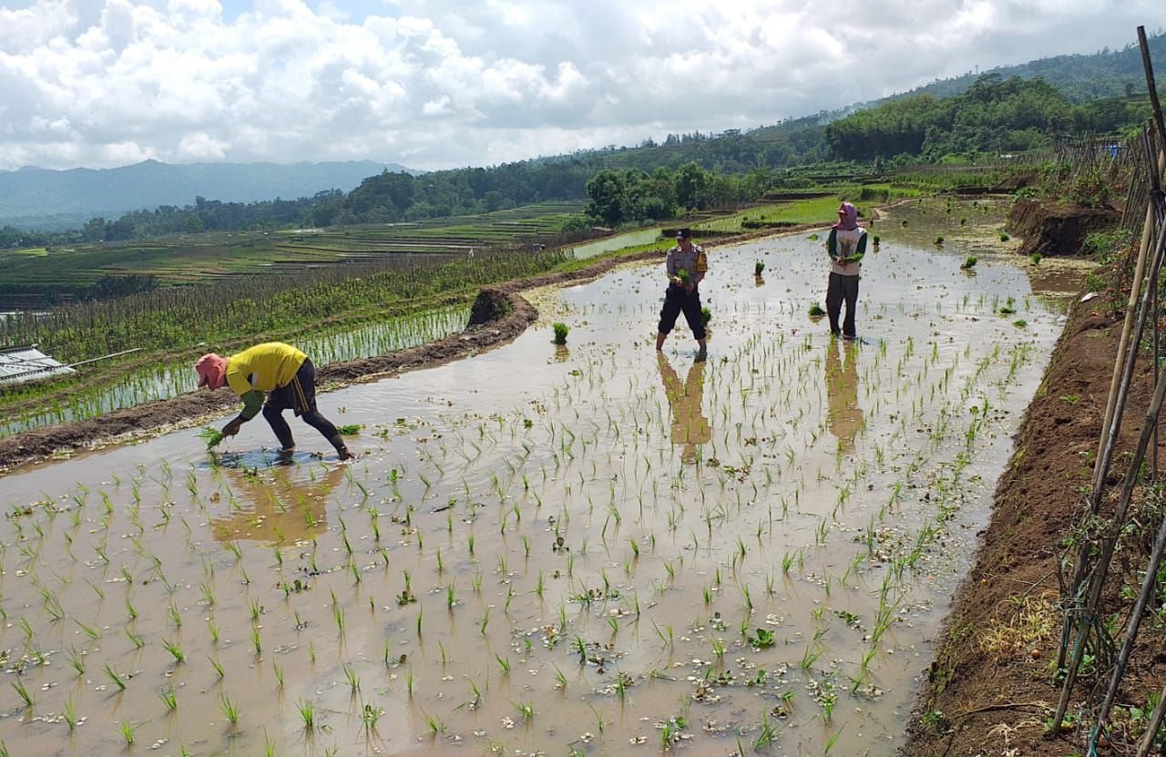 Bhabinkamtibmas Polsek Tombolopao Polres Gowa, Bripka Suherman, Minggu (23/2/2020) pagi, membantu warga binaannya Herman Rala (43), menanam padi di sawah Lingkungan Dataran, Kelurahan Tamaona.