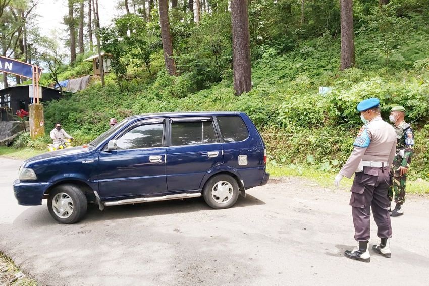 Dalam rangka mencegah penyebaran Covid-19, personil Polsek Tinggimoncong Polres Gowa dipimpin langsung oleh Kapolsek Tinggimoncong Iptu Hasan Fadhlyh, SH dan didampingi anggota TNI, menutup akses jalan masuk ke wilayah Kecamatan Tinggimoncong, Malino, Sabtu (28/03/2020).