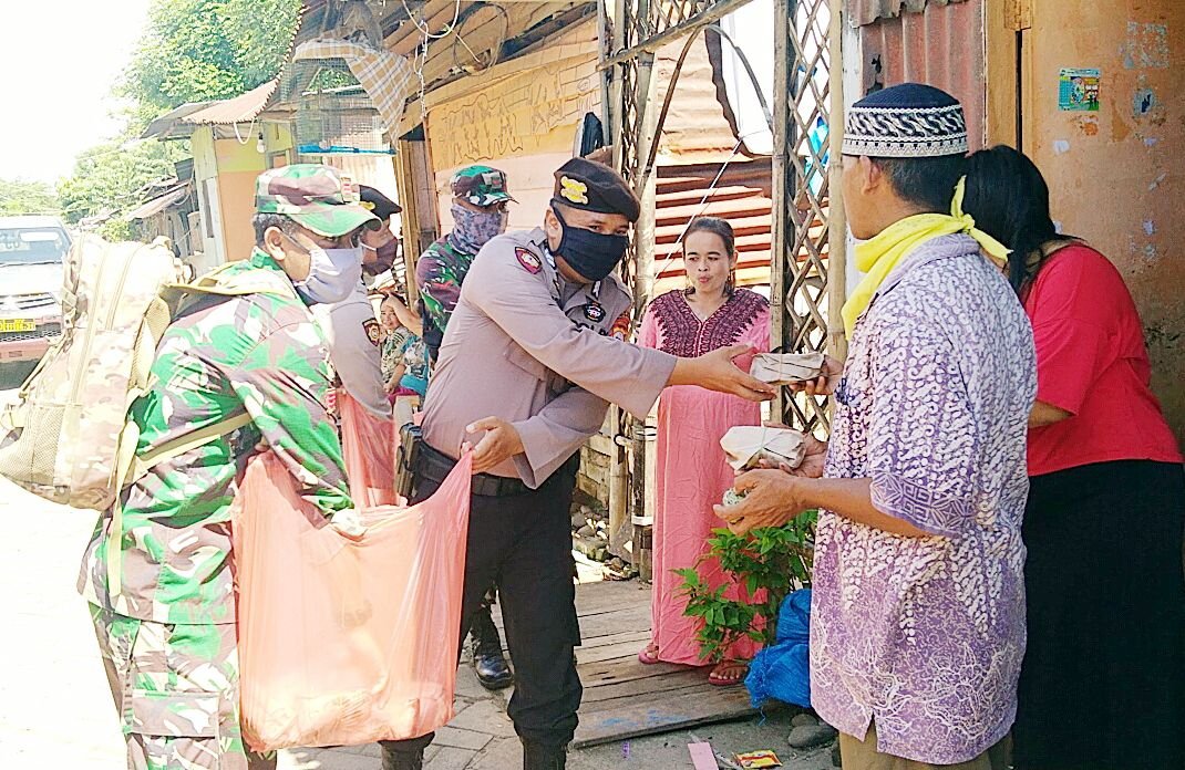 Di hari kedua untuk membantu warga masyarakat kecil dimasa imbauan pemerintah untuk berdiam di rumah, jajaran kepolisian Polres Gowa dan Kodim 1409 kembali bagikan makanan siap saji di beberapa pemukiman masyarakat di sekitaran bantaran Sungai Jene'berang, Kecamatan Somba Opu, Kabupaten Gowa, Jumat (17/042020) siang tadi.