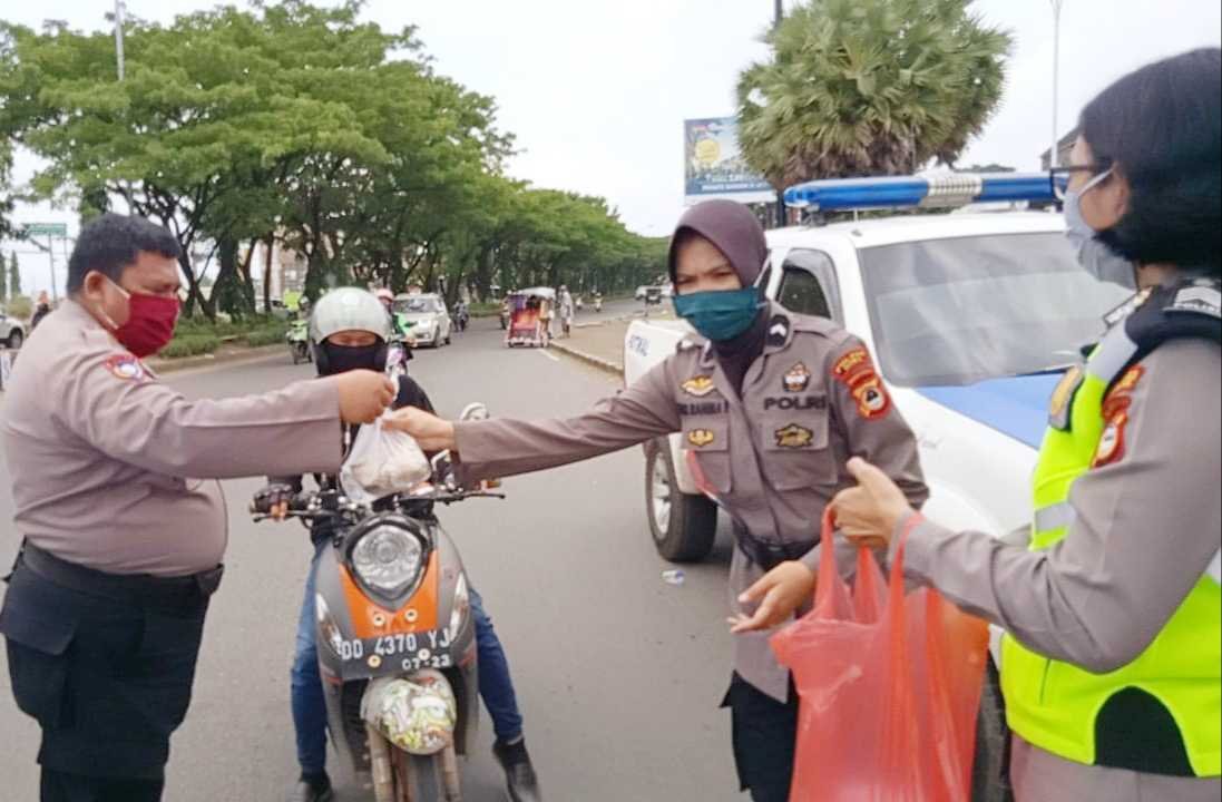 Dengan beriringan menenteng makanan siap saji yang dibagikan ke warga itu disambut antusias dari pengendara dan warga yang melintas.