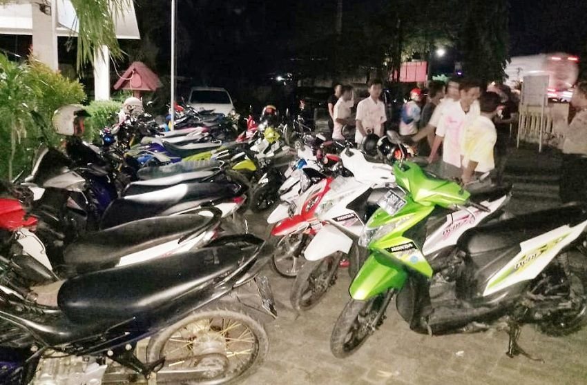 Sekitar pukul 19.00 Wita, puluhan pelajar gabungan berbagai SMA di Maros diantaranya SMAN 1, SMAN 11, SMK 1, SMA PGRI, SMK Kebangsaan dan lainnya, bersama sebanyak 28 unit kendaraan motor digelandang ke Mako Polsek Lau untuk mendapat tindakan dan pembinaan. (im/jw)
