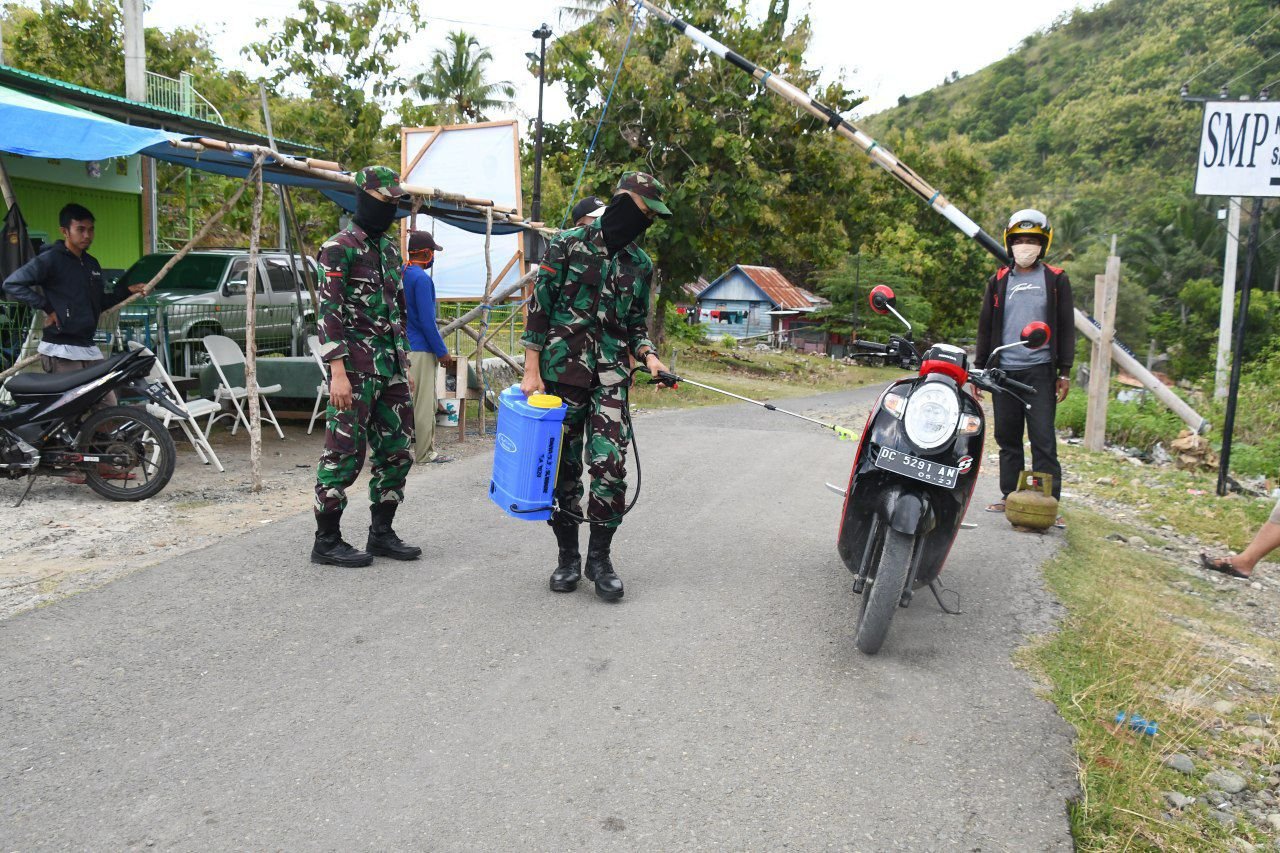 Korem 142/Tatag terus berupaya melakukan pemutusan Covid-19 dengan melakukan penyemprotan disinfektan di rumah-rumah warga, fasilitas umum, dan kendaraan di Desa Sumare Kec. Simboro dan Kepulauan Provinsi Sulawesi Barat (Sulbar), Sabtu (9/5/2020).