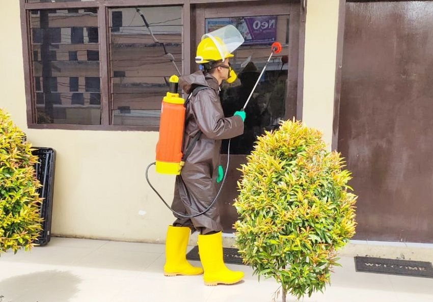 Seperti halnya kantor Polres Gowa disemprot cairan disinfektan yang dilakukan oleh personil dari Urkes Polres Gowa.